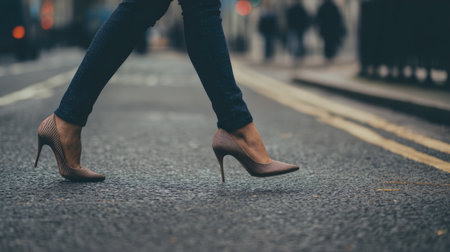 A stylish woman walks confidently on a city street wearing high heels, showcasing urban fashion and movement in a busy environment.