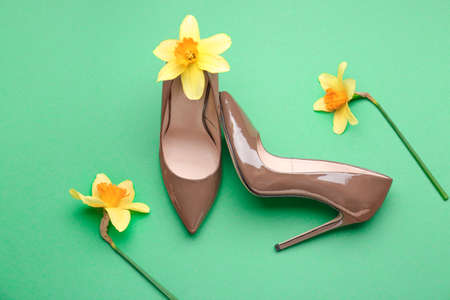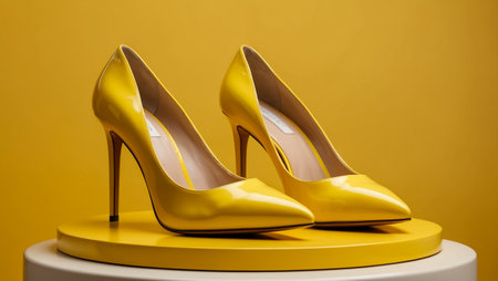 chic yellow patent leather stiletto shoes on a colored background fashionable