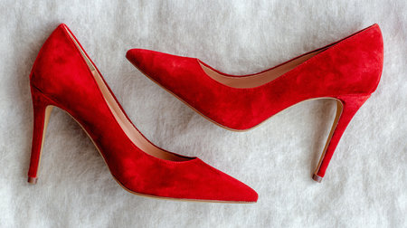 A pair of stylish red shoes with high heels, making a bold fashion statement on a sleek black surface