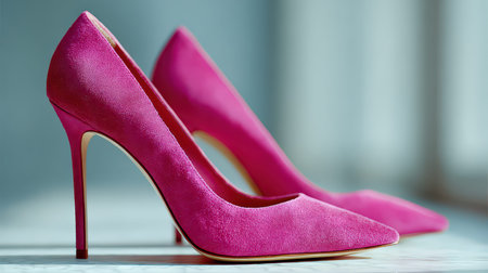 This elegant pair of pink high heels showcases a soft suede texture against a blurred background. Perfect for those seeking a stylish footwear choice for special occasions or fashion-oriented settings.