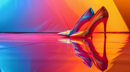 A pair of stylish high heels reflecting colorful lights, showcasing fashion and elegance with a modern touch