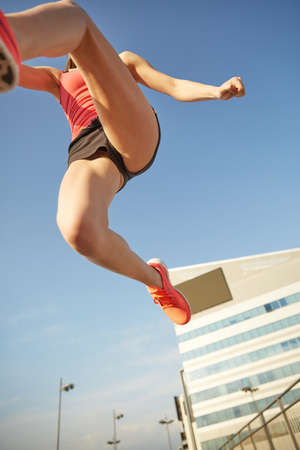 Athlete woman feet with sneakers jumping outdoors