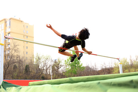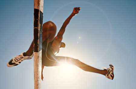 Know your limitations and defy them. Low angle shot of an athletic practicing high jump.