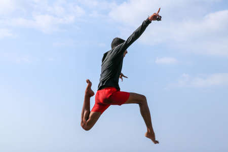 Man jumping happy on the beach with a blue sky in the background. Young cheerful Indonesian jumps. A teenager in a good mood jumps in the air. Background with blue sky. Sunny tropical day.