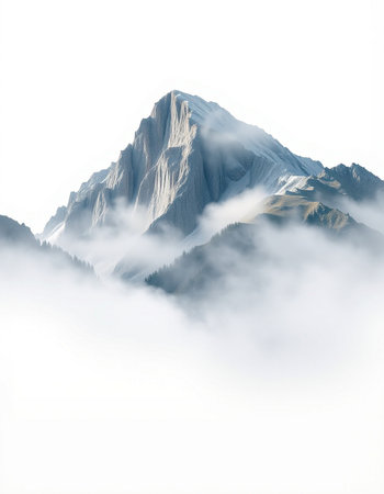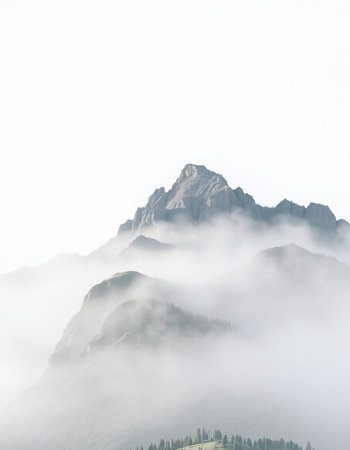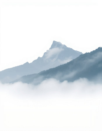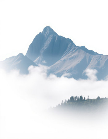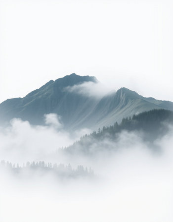 Mountain landscape with fog and forest in the foreground, isolated on white background
