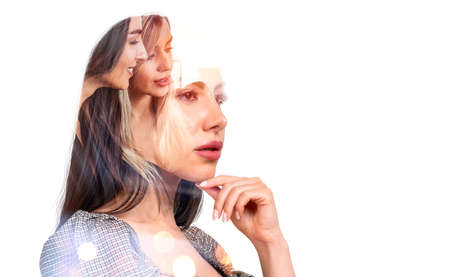 The closeup double exposure picture between young adult beautiful female caucasian human and bright beautiful nature in the morning or evening that the picture stand for peaceful of the life. AIGX01.