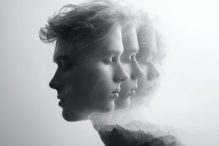 Profile of a serene woman with long hair, portrayed in a minimalist black and white aesthetic emphasizing beauty, calmness, and emotional depth