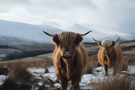 Highland cows in the snow on the background of mountains, wildlife