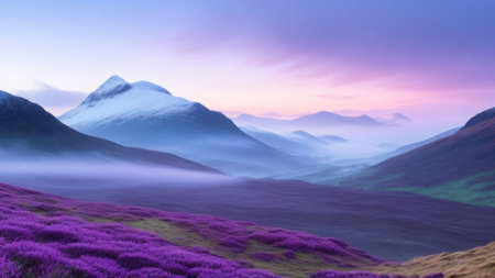 Winding road through the scenic scottish highlands with vibrant purple heather