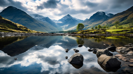 Mountain landscape with lake and reflection in water, Scotland, UK