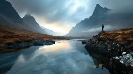 Beautiful mountain landscape with lake and man in front of it.