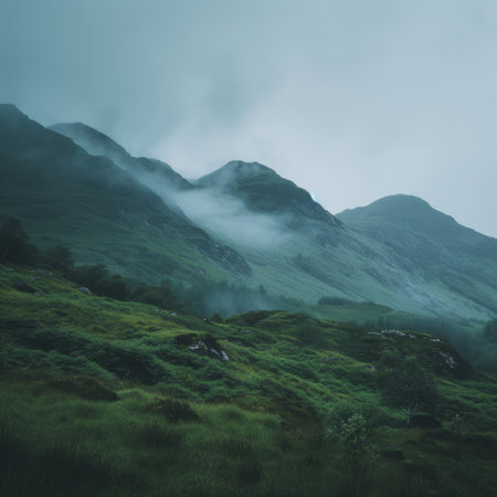 rolling hills of the Scottish Highlands with low-hanging clouds, rugged terrain, misty greens and earthy browns, ancient and mysterious landscape