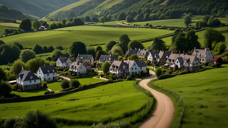 Cinematic view of a quaint village nestled in the serene hills at twilight