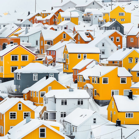 a village of yellow and blue homes covered with snow, white and crimson, , white and orange