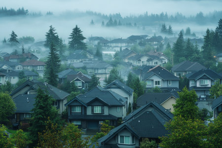 Morning mist envelopes a residential neighborhood in british columbia from an aerial perspective