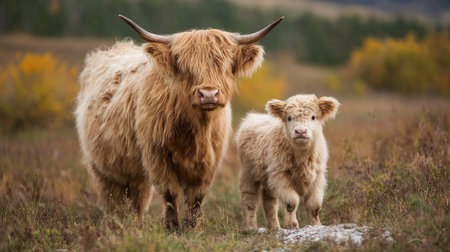 Two highland cattle, an adult and calf, are pictured in a natural outdoor setting. They have long, shaggy, light-brown fur, and large horns. The composition shows the animals from the front, with the field and a blurred background featuring autumnal colors. The image may be suitable for illustrating wildlife, agriculture, or environmental topics.