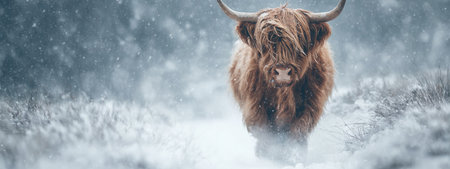 A Highland cow is shown walking in a snow-covered environment. The animal, with its brown fur and long horns, is the focal point, contrasted against the white snow. The image showcases natural lighting and could be used for various commercial or editorial projects related to wildlife or nature.