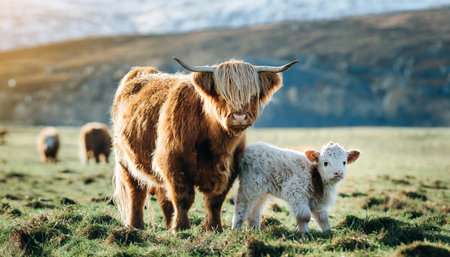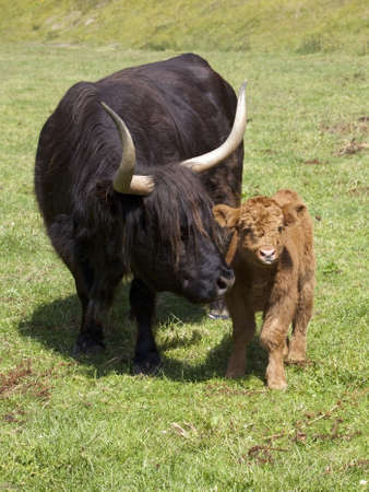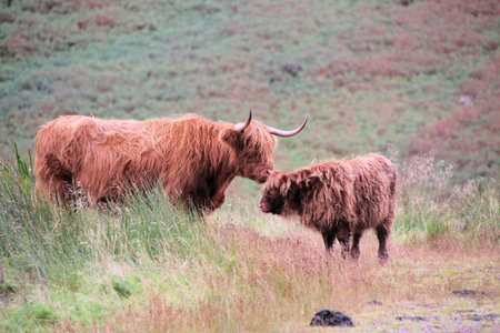 Scottish highland cow and calf in the Scottish highlands.