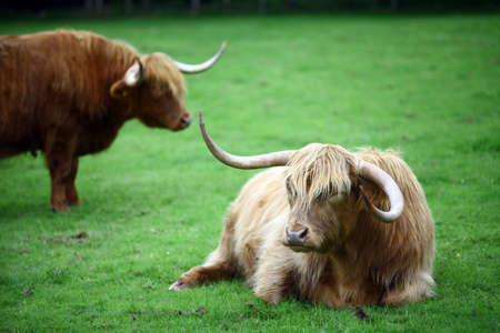 Color image of some Highland Cows on a green field.