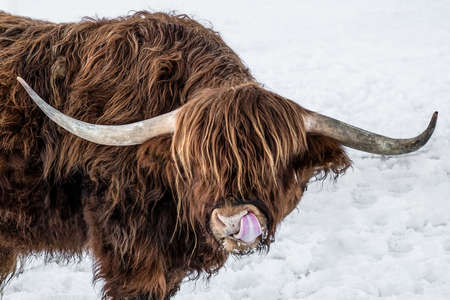 Funny Animals background - Scottish highland cow with tongue out in winter with snow, cow in snowy field in the beautiful black forest