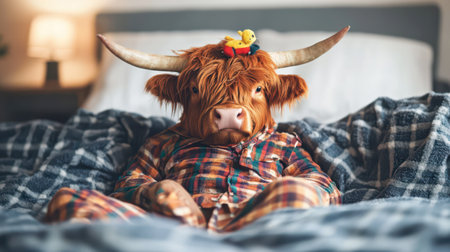 In a cozy bedroom, a Highland cow wearing a plaid shirt lounges comfortably on a bed, with a small rubber duck perched atop its head, creating a whimsical and humorous vibe.