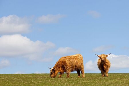 two highland cows in a pasture on the brow of a hill in springtime under a blue sky