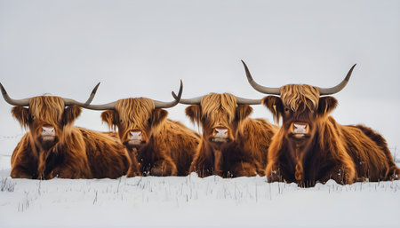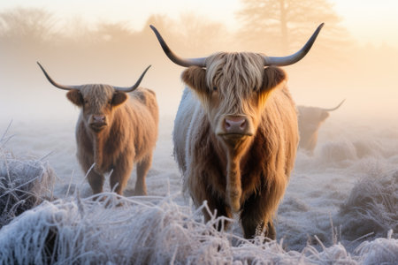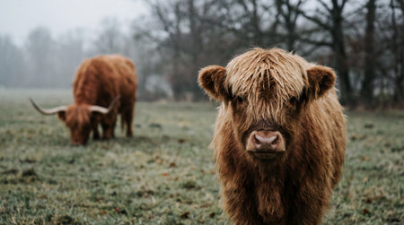 Highland cows gazing away in winter scenery, foggy morning