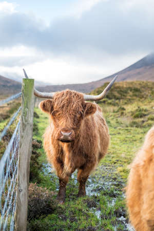 Close up of Highland Cattle, a Scottish cattle breed. Hairy cow with long horns and wavy coats. On the field in Isle of Skye, Scottish Highlands.