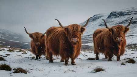 Highland cows in the snow on the background of mountains, wildlife