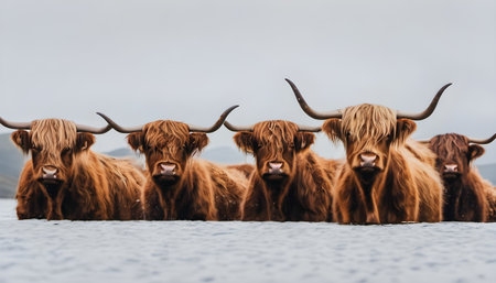 Scottish highland cattle standing in a row on a lake.