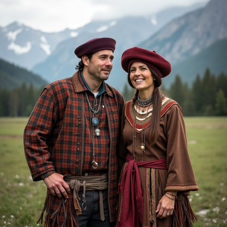 Portrait of a happy couple in traditional clothes in the mountains.