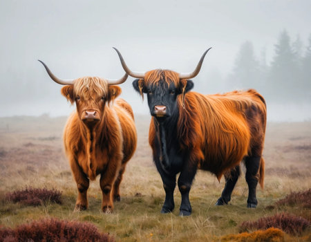 Scottish highland cattle on a foggy day in the Scottish Highlands