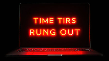 A laptop screen displays a glowing warning that time is running out while a user works on tasks inside a home or office setting.