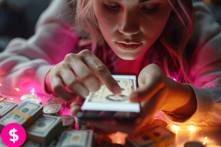Woman Uses Smartphone Surrounded by Cash and Pink Lights