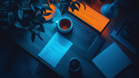 A serene workspace scene featuring a backlit laptop, a steaming cup of tea, and a neatly arranged sheet of paper, enhanced by lush plant accents and a calming ambiance.