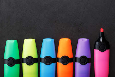 Multi-colored markers in a row on a black background, top view. The concept of creativity and study time