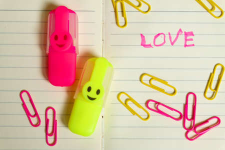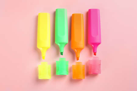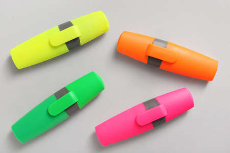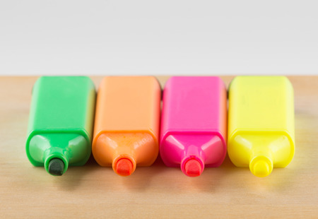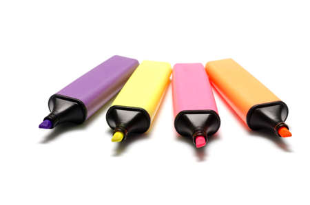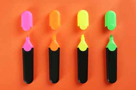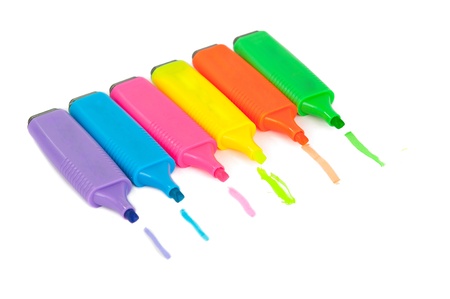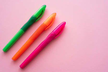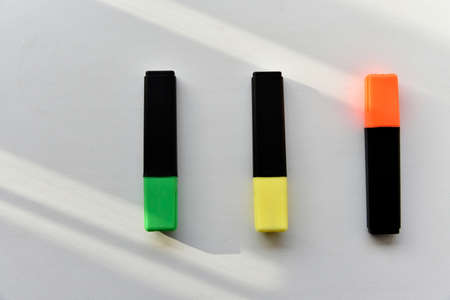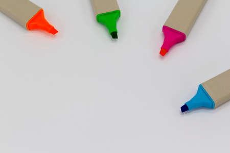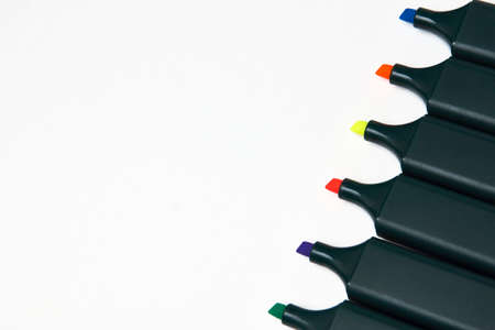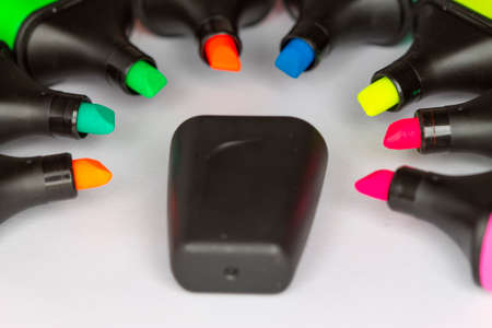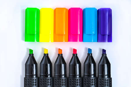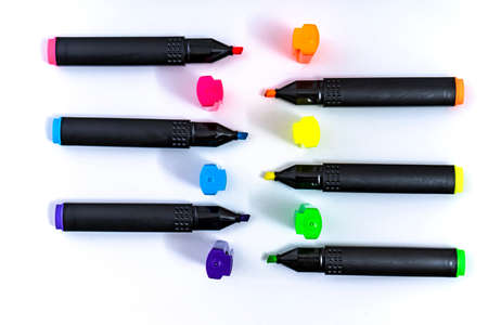 Bright colored markers for highlighting text on white background, colored felt-tip pens for drawing