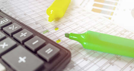 Close-up notebook with a drawn graph of the growth of the exchange rate of bitcoin. Finance. Calculator, notebooks, colored paper clips, markers, glasses