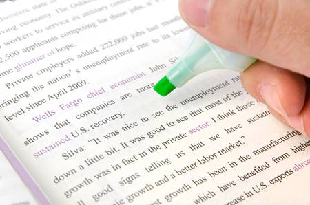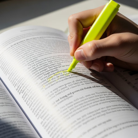 Flat lay of colorful study supplies and textbook open to a highlighted passage in quiet setting
