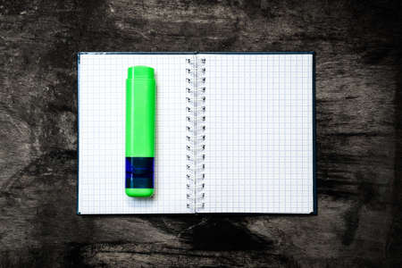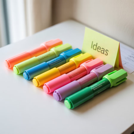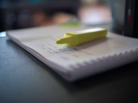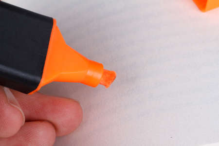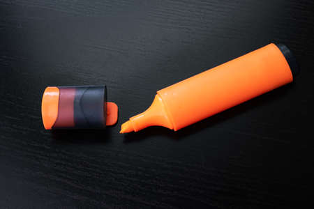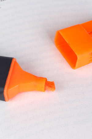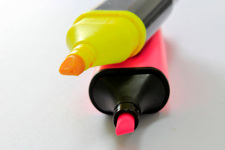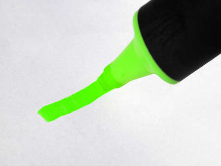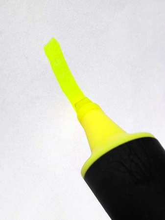 Highlighter pen on the floor, broad felt-tipped pen used to overlay transparent fluorescent color on text, leaving it legible and emphasized.