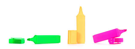 Markers isolated on white background. Blue, green and yellow highlighters lays in line.