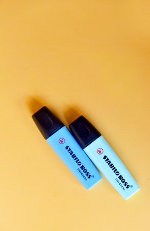 Sumbawa, Indonesia - June 16, 2022: Colorful text highlighter trademark Stabilo Boss on Blue and orange background paper. pen highlight office tools equipment