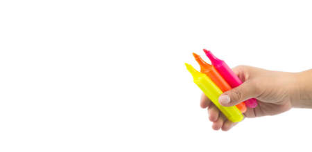 female hand holding various colored markers, isolated on white, space for text