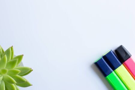 Colored highlighters set and home plant succulent in soft focus on white background. Back to school, office, business, home office