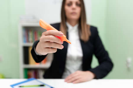 Businesswoman Holding Marker With One Hand And Pointing Important Ideas. Woman With Colored Pen Showing Recent Updates. Executive Displaying Late News.