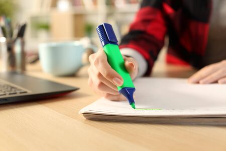 Close up of student girl hands using green highlighter pen on notebook on a desk at home