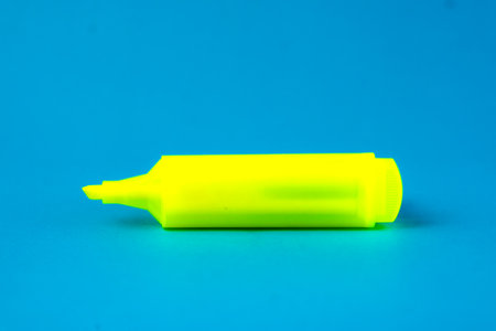 A bright yellow highlighter marker lying horizontally on a vibrant blue background. The close-up shot emphasizes its neon color and chisel tip design, ideal for office or school use.