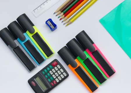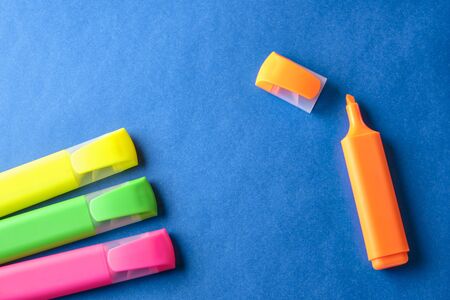 Colorful markers, highlighter markers on white background. Copy space. Back to school