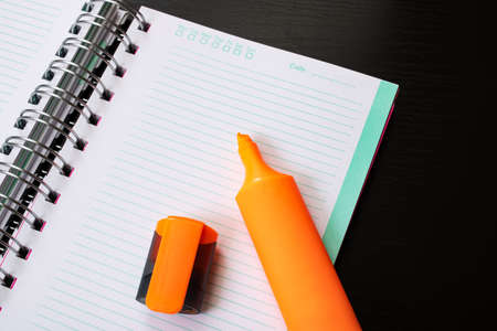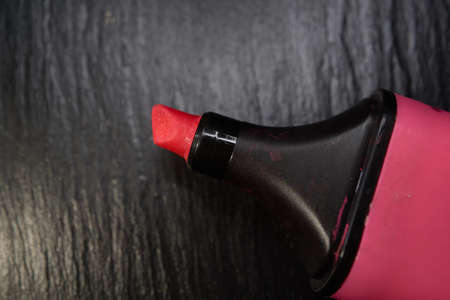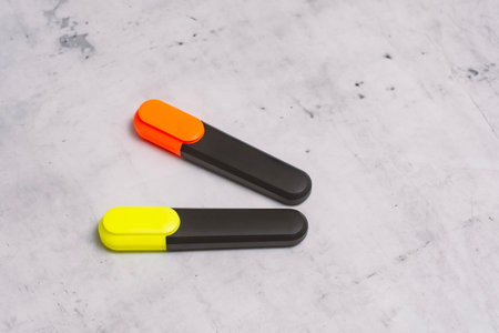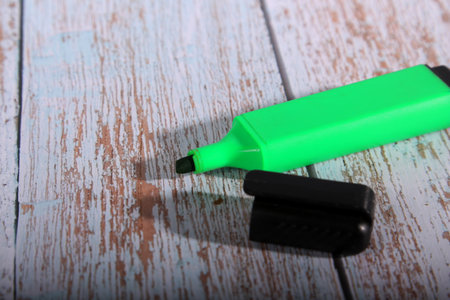 Highlighter pen on the floor, broad felt-tipped pen used to overlay transparent fluorescent color on text, leaving it legible and emphasized.