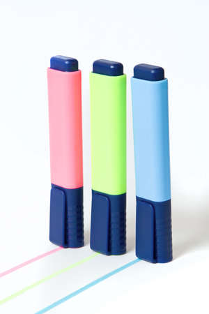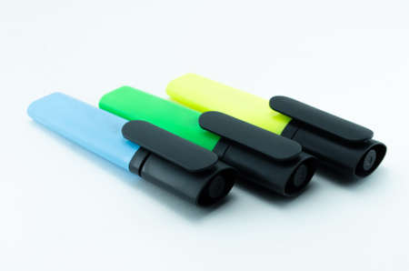 Markers isolated on white background. Blue, green and yellow highlighters lays in line.